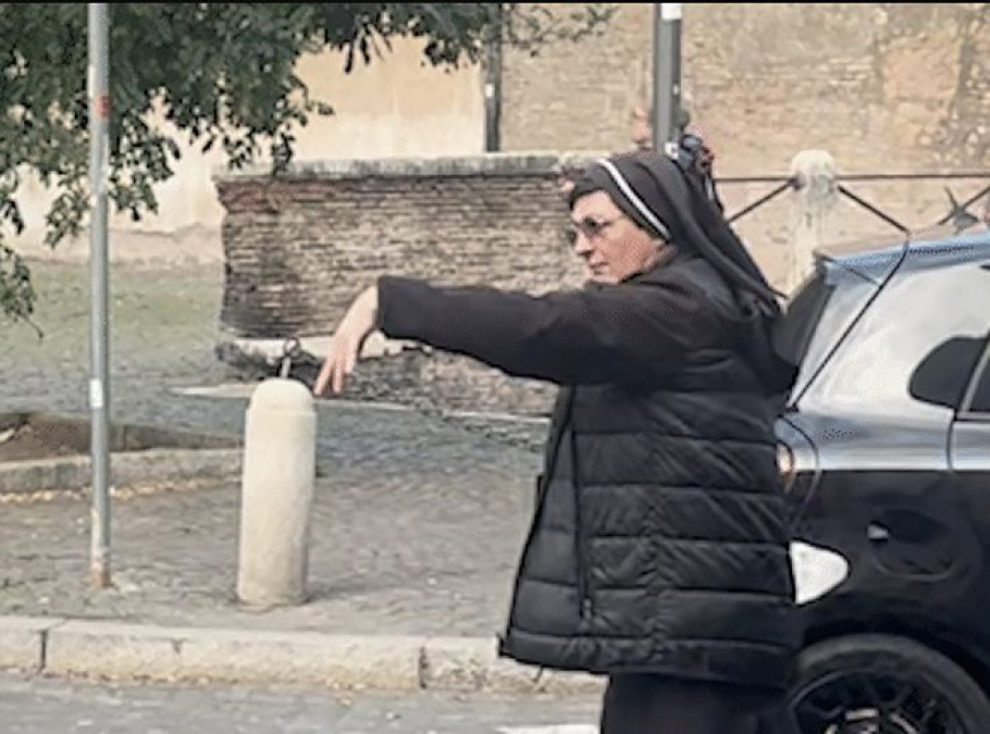 Na snimci se vidi redovnica ispred školskih vrata u Rimu kako graciozno usklađuje promet umjesto da postiže golove. Njezina je brza reakcija u nekoliko minuta razriješila zastoj blizu Koloseuma, dokazujući kako se i redovničke odore i prometni kaos mogu složiti kad je motiv ljubav.